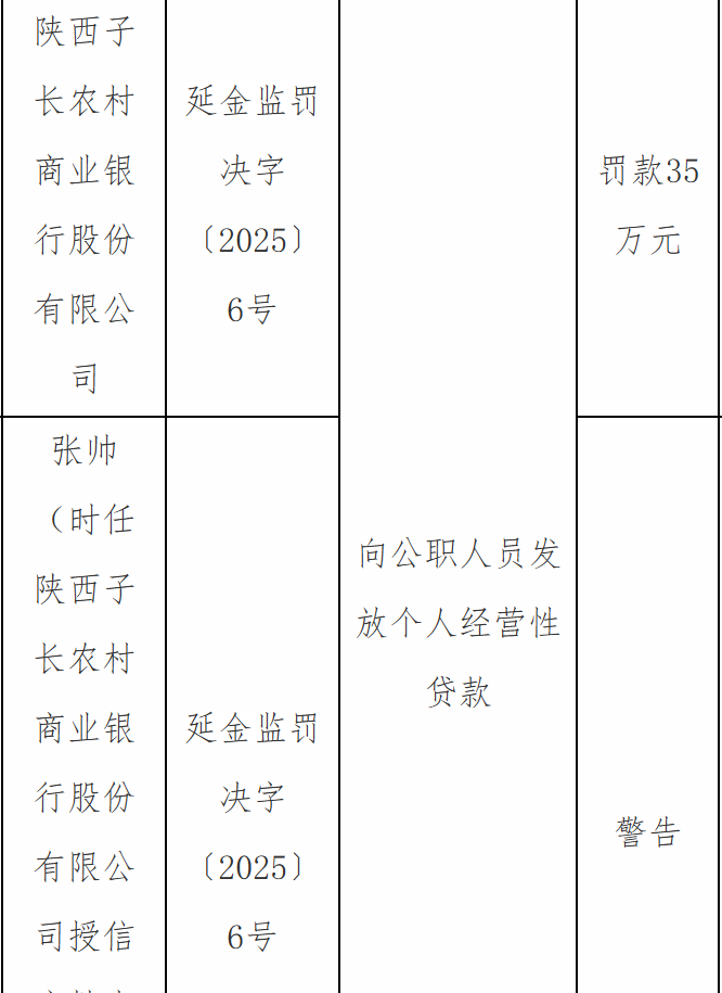 12月24日,国家金融监督管理总局延安监管分局行政处罚信息公示表显示,陕西子长农村商业银行股份有限公司因向公职人员发放个人经营性贷款被罚款35万元;张某被警告。