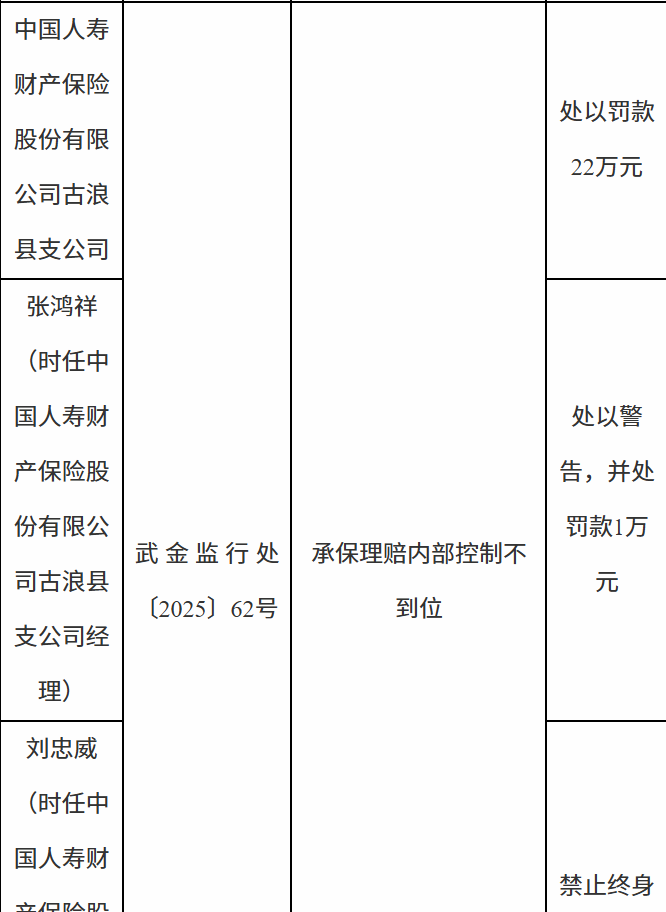 12月24日,国家金融监督管理总局武威监管分局行政处罚信息公开表显示,中国人寿财产保险股份有限公司古浪县支公司因承保理赔内部控制不到位被罚款22万元;张某祥被警告并处罚款1万元;刘某威被禁止终身进入保险业。
